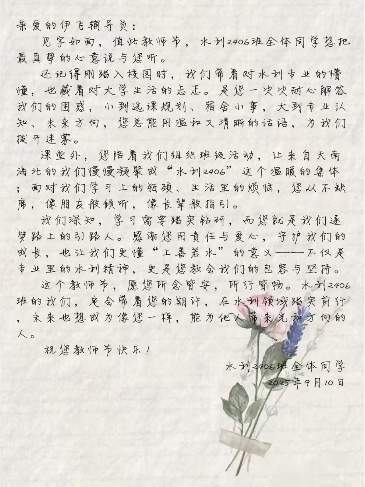 同学们在信中回忆了老师们的悉心指导与温暖陪伴:或感谢专业课教师深入浅出的讲解,或铭记导师熬夜帮助修改论文的付出,或感念辅导员老师在迷茫时的耐心开导。字里行间充满真挚的敬意与美好的祝愿。